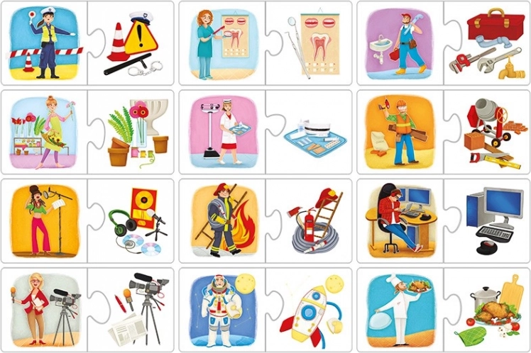 Il set contiene 24 tessere con cui è possibile comporre 12 immagini che rappresentano professioni e caratteristiche.