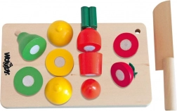Set divertente e interattivo WOODY per piccoli cuochi comprende un tagliere di legno, un coltello e 12 pezzi di frutta e verdura che possono essere tagliati in sicurezza grazie al velcro.