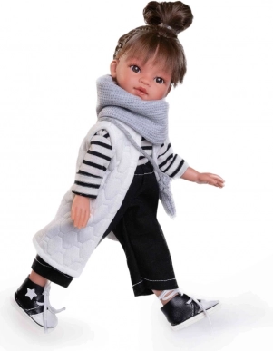 La bambola Emily del marchio Antonio Juan è realizzata in vinile completamente, che le conferisce un aspetto realistico e proprietà tattili. Ha capelli su tutta la testa ed è vestita con abbigliamento dettagliato, una parte del quale è in cotone organico coltivato senza trattamenti chimici.