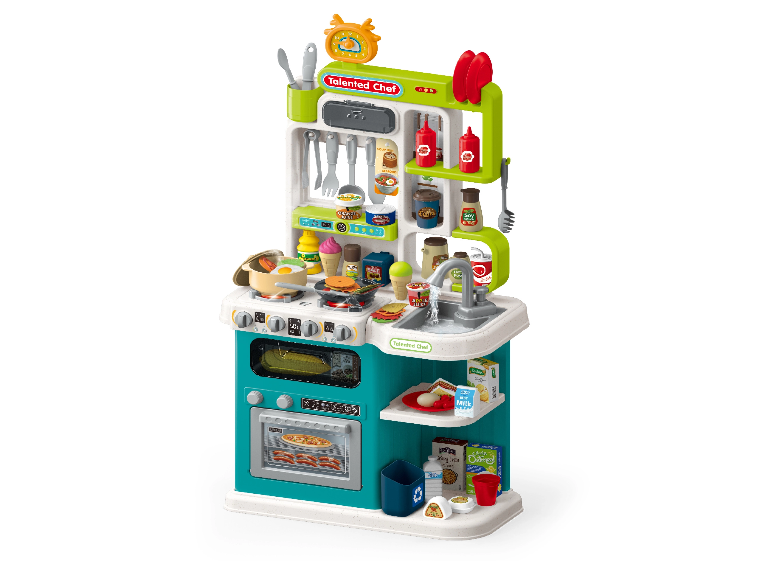 Elke kinderkeuken verrast met een rijk pakket aan keukenaccessoires: potten en pannen, bestek, thee- en koffiesets, kruiden, speelvoedsel en schortjes voor kleine chef-koks. Praktische elementen zoals plankjes, opbergkastjes, magnetische deurtjes, een menubord of een werkbladhoogte aangepast aan kinderen maken organiseren makkelijker; u zult de duurzame materialen, de eenvoudige montage en de lange levensduur waarderen voor dagelijks koken in de fantasiewereld.