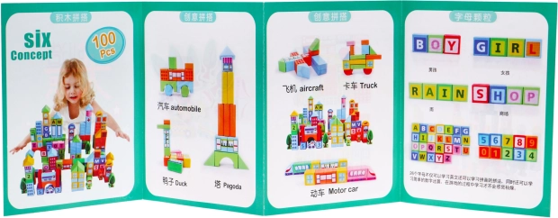 | - 100 houten blokken in verschillende kleuren en vormen, - geïllustreerde handleiding. | |
