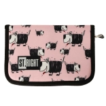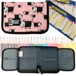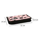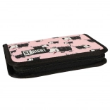 Praktische schooletui met twee kleppen in roze design met honden. Biedt een overzichtelijke indeling van schoolspullen, is afsluitbaar met rits en heeft een ergonomische ritstrekker. Binnenin vind je tussenschotten en elastische houders voor stiften, potloden en een liniaal; inbegrepen zijn ook een tafels-overzicht en lesrooster.