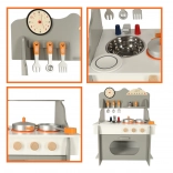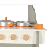 Houten kinderkitchen is ideaal voor kleine ontdekkers die graag de activiteiten van volwassenen nadoen. Met deze kitchen kunnen ze veilig de magie van koken ontdekken. De kitchen is uitgerust met het nodige keukengerei zoals een pan, pannen, snijplank en ook kruidenpotjes, wat het spel extra realistisch maakt.