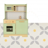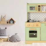 Laat kinderen hun ouders nadoen in een veilige omgeving met de muntkleurige houten keuken. Bevat alle essentiële elementen zoals een oven, magnetron, beweegbaar fornuis en gootsteen, die realistische geluiden maken voor een levensechte kookervaring.