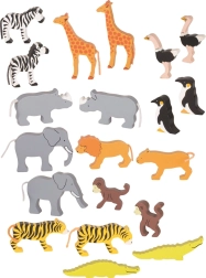 De set bevat verschillende diersoorten zoals giraffen, olifanten, zebra's, leeuwen en meer, wat zorgt voor gevarieerd educatief plezier.