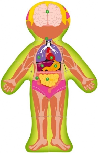 Puzzelstukjes met de figuur van een meisje en aangegeven organen, onderplaat met skelet en genummerde lijst