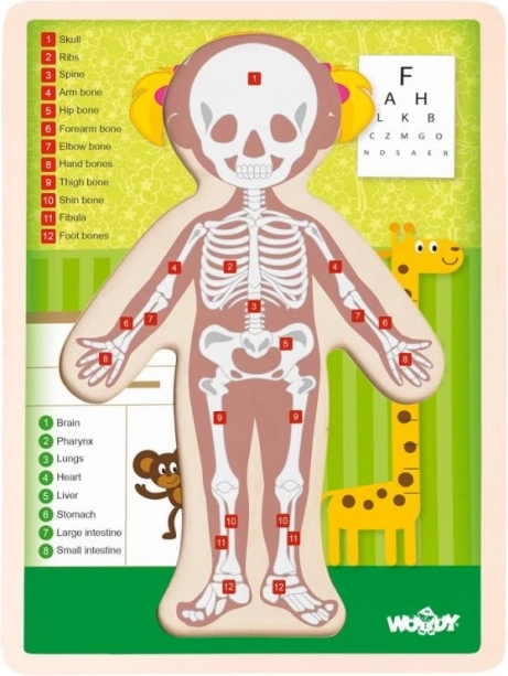 Deze hoogwaardige houten puzzel stimuleert de verbeelding, fijne motoriek en het logisch denken. Het kind legt twaalf stukjes met de afbeelding van een meisje; op de achterkant van de stukjes staan de menselijke organen. De onderliggende afbeelding toont het menselijk skelet en bevat een genummerde lijst van organen en botten – een geweldige basis voor een eerste kennismaking met anatomie in het Engels.