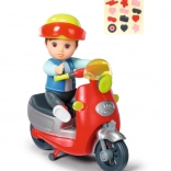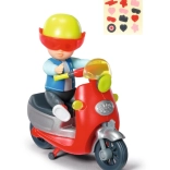 De rode scooter met speelse details wordt aangevuld met een gele helm en een vel stickers, zodat kinderen de uitrusting precies naar hun eigen fantasie kunnen versieren.