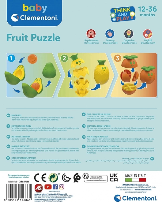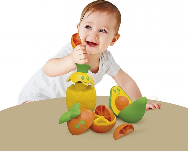 Ontdek slim en duurzaam spelen met CLEMENTONI BABY. De set Stapelbaar fruit brengt drie schattige vruchten – avocado, ananas en sinaasappel – die kinderen motiveren om te ontdekken, sorteren en stapelen. Elk element is ontworpen om de ontwikkeling van logisch denken, visuomotorische coördinatie en tactiele waarneming te ondersteunen.