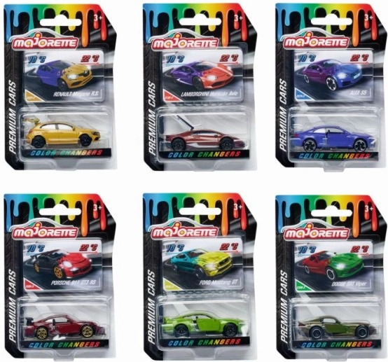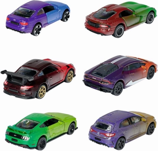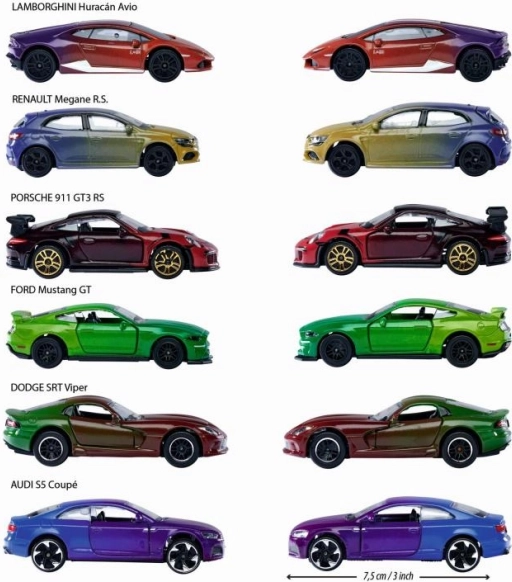 Kies uit PORSCHE 911 GT3 RS, LAMBORGHINI HURACÁN, AUDI S5 COUPÉ, FORD MUSTANG GT, DODGE SRT VIPER en RENAULT MEGANE R.S. – elk in aantrekkelijke tinten met Color Changers-effect.