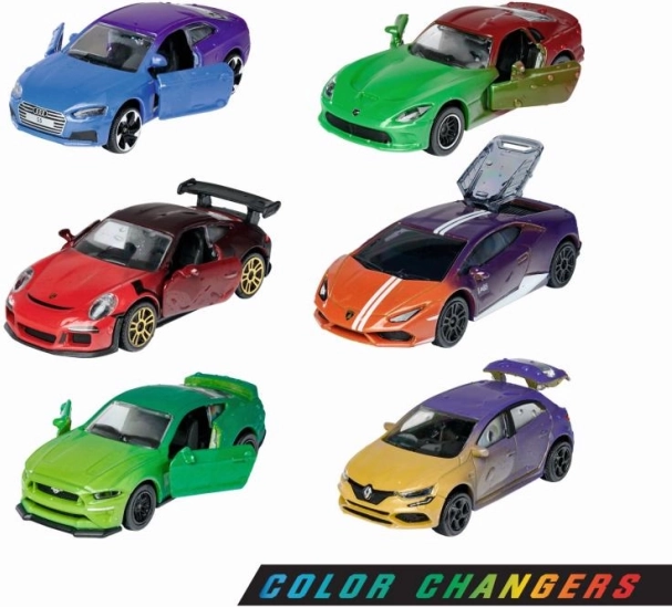 Deze gedetailleerde autootjes bieden het unieke Color Changers-effect: bij afkoeling tot ca. 10 °C verandert de kleur en bij opwarming tot ongeveer 22 °C keert de oorspronkelijke tint terug. Elk model is van metaal met kunststof accenten, heeft freewheel, openende delen en geveerde wielen voor een soepelere rit.