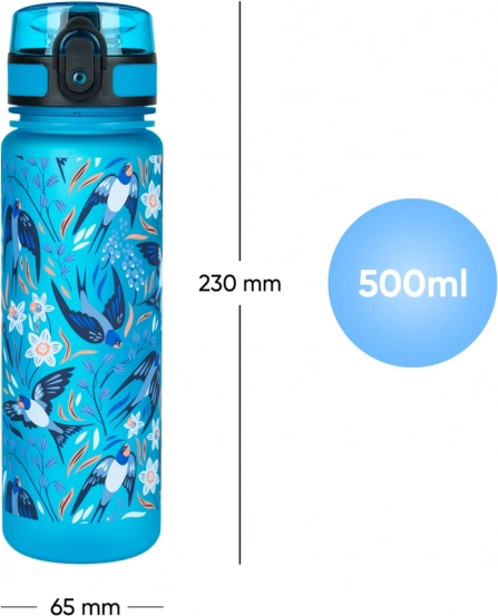Stijlvolle tritan drinkfles van BAAGL met zwaluwenmotief en een inhoud van 500 ml, ideaal voor school, uitstapjes en sport. Voorzien van een vergrendelbare dop tegen morsen, een polsriem voor makkelijk dragen en een ingezet zeefje voor fruit of thee. Gemaakt van veilig BPA-vrij tritan, geurloos en geschikt voor hete dranken.