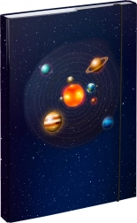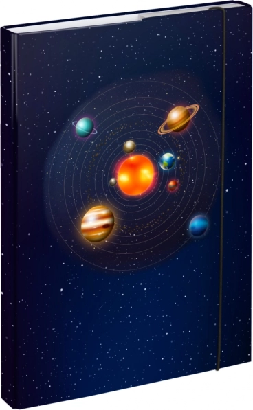 Stijlvolle map voor schriften in A4-formaat met planetenmotief biedt betrouwbare bescherming voor je schriften en documenten. Dankzij de binnenflap tegen uitvallen en de elastische band blijft alles veilig op zijn plaats, thuis en onderweg.