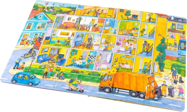 Dit grootformaat boek is ideaal om samen te lezen en te vertellen. Kinderen ontdekken wat er in de stad gebeurt van ’s morgens tot ’s avonds – van het werk van de vuilnismannen en boodschappen doen, via de peuterspeelzaal/kleuterschool, de bouwplaats, brandweer en politie, tot aan middagpret in het park en uitstapjes naar het meer of de boerderij. Elke pagina staat vol aanknopingspunten om te praten en details te zoeken.