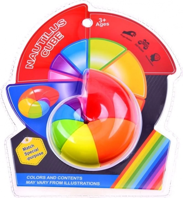 Een kleurrijke draaibare spiraal in de vorm van een schelp. Elk van de zeven gekleurde secties bestaat uit drie delen. - draai om te mixen en stel de Nautilus weer samen in de oorspronkelijke vorm - ontwikkelt fijne motoriek, logica en strategie - hoogwaardige en duurzame afwerking. In de verpakking zit een geïllustreerde handleiding. Afmeting van de samengestelde puzzel ca. 8,5 x 6 cm