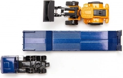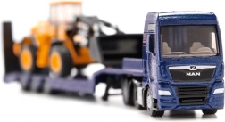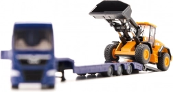 Deze gedetailleerde set combineert een blauwe MAN TGX-trekker met dieplader en een JCB bouwwiellader. De duurzame metalen (die-cast) constructie met scherpe bedrukking en vrij rollende wielen biedt zowel een authentieke look als functionaliteit. Dankzij de beweegbare bak van de wiellader en de oprijplaten van de aanhanger kunnen kinderen eenvoudig het transport van bouwmachines ensceneren.