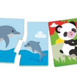 Ontdek de eerste puzzel die kinderen op een speelse manier dieren en hun jongen laat leren kennen. De grote, stevige stukken zijn ontworpen voor kleine kinderhanden en dankzij de gevormde uitsparingen bieden ze eenvoudige zelfcorrectie – het kind ziet zelf of de stukken bij elkaar passen.