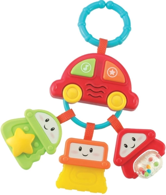 Dit is een hangend autootje in de vorm van een sleutelhanger met drie sleutels. Het bevat twee kleurrijke functionele knoppen die verschillende geluiden, effecten en leuke melodieën afspelen.