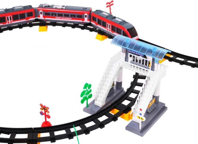 - 62-delige set met rechte en gebogen rails, railverhogingen, station en accessoires.