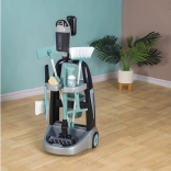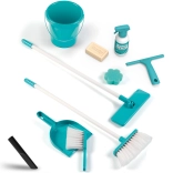 De kar bevat een borsteltje, mop, blik, veger, emmer, spons en schoonmaakmiddelen, die kinderen volledig vermaken tijdens hun denkbeeldige schoonmaakactiviteiten.