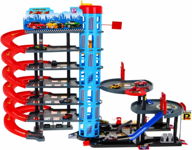 Kinderen kunnen de lift en glijbanen gebruiken om de auto's tussen de verschillende verdiepingen van de parkeerplaats te verplaatsen.