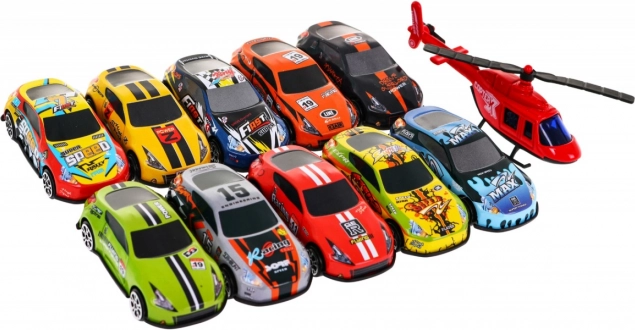 De set bevat 10 autootjes, een helikopter en decoratieve stickers voor nog meer plezier en creativiteit.