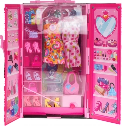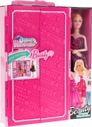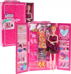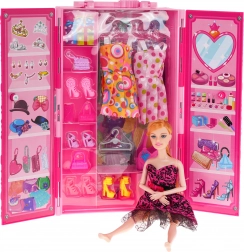 Ontdek een betoverende set voor kleine modeliefhebbers: een pop met beweegbare hoofd, armen en benen, een roze draagbare kledingkast en een uitgebreide set modieuze accessoires, inclusief jurken, handtassen en schoenen. Een geweldige speelgoedset voor creatief verkleden, het ontwikkelen van fantasie en leren opruimen.