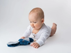 Het speeltje is gemaakt van veilige materialen met verschillende structuren (minky, katoen) voor rijke tactiele stimulatie. Geborduurde details verhogen de veiligheid, zonder kleine afneembare onderdelen. Gekleurde labeltjes/taggies stimuleren de fijne motoriek en natuurlijke nieuwsgierigheid.