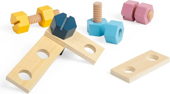 Vast- en losschroeven en het verbinden van onderdelen ontwikkelen op een natuurlijke manier de vingervaardigheid, oog-handcoördinatie en het geduld van kinderen vanaf 18 maanden.