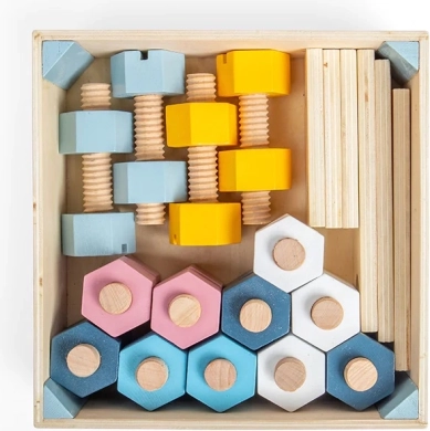 Deze tijdloze houten set met moeren, bouten en latjes met gaten moedigt kinderen aan om de eerste principes van constructief spel te ontdekken. Zachte pastelkleuren, de aangename textuur van hout en veilige vormen prikkelen de zintuigen en de verbeelding.