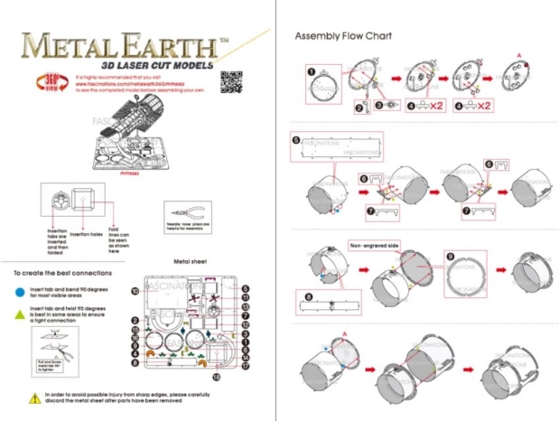 Het model wordt zonder lijm in elkaar gezet – onderdelen worden verbonden met kleine vergrendelingen en omgebogen lipjes. Aanbevolen voor leeftijd 14+. Het voltooide model heeft compacte afmetingen van circa 7,5 × 6 × 5 cm, en past daardoor perfect op elk bureau.