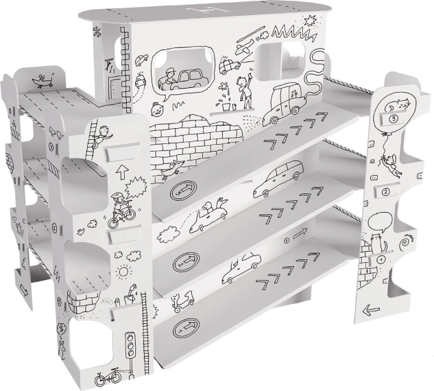De professionele, heldere zwarte opdruk is ideaal om in te kleuren met potloden, stiften, markers en verf. Het karton absorbeert vocht goed, verkreukelt niet en bloedt niet door. Open ruimtes, hellingen en plankjes stimuleren creativiteit, parkeerspel en de ontwikkeling van de fantasie.