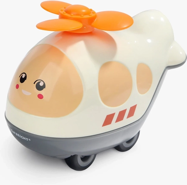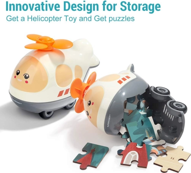 De kunststof helikopter met wieltjes heeft aan de onderkant een klep, zodat kinderen de hele puzzel of hun kleine schatten erin kunnen opbergen.