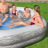 Dit ruimtebesparende hoekzwembad met steenmotief past perfect op terras en in de tuin. Duurzaam PVC en stevige wanden zorgen voor een lange levensduur, terwijl de zachte bovenrand uitnodigt tot comfortabel zitten en afkoelen op hete dagen. Dankzij het praktische aftapventiel laat je het zwembad na het zwemmen eenvoudig leeglopen.