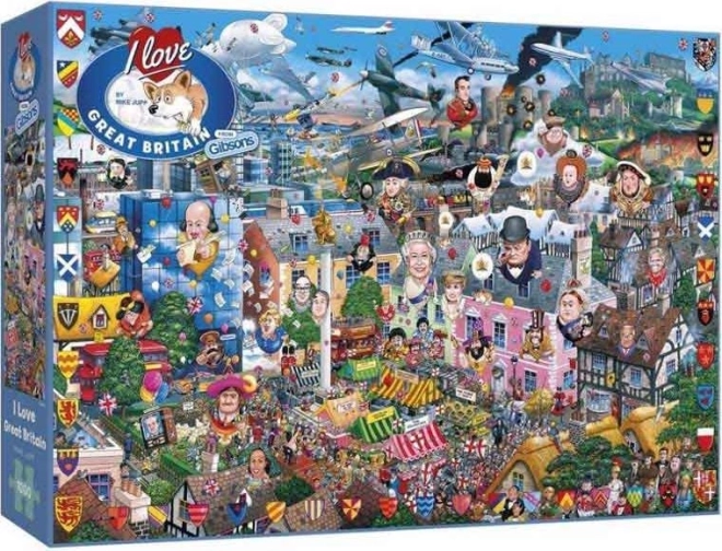 Puzzel Ik Hou van Engeland van merk Gibsons neemt je mee naar de prachtige wereld van Engeland met 1000 stukjes, waarmee je een schitterend beeld creëert.