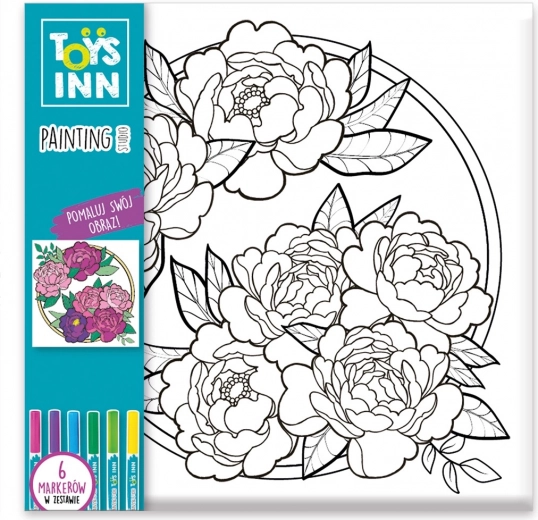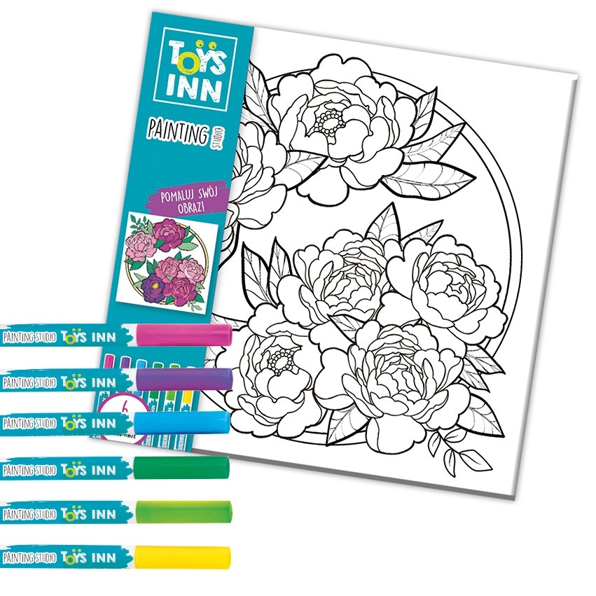 Ontdek een leuke creatieve set voor kinderen – een kleurplaat op canvas van 29 × 29 cm met stiften. Dankzij 6 gekleurde stiften maakt je kind een origineel en kleurrijk bloemenmotief, terwijl het fijne motoriek, creativiteit en geduld ontwikkelt.