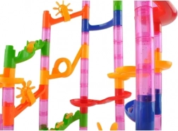 Deze kleurrijke knikkerbaan stelt kinderen in staat gevarieerde routes met verschillende moeilijkheidsgraden te bouwen. Onderdeel van de set zijn windmolentjes, loops en barrières die door de knikkers tijdens het rijden worden geactiveerd. De onderdelen verbinden eenvoudig en intuïtief, zodat je snel configuraties kunt wijzigen en nieuwe ideeën kunt testen.