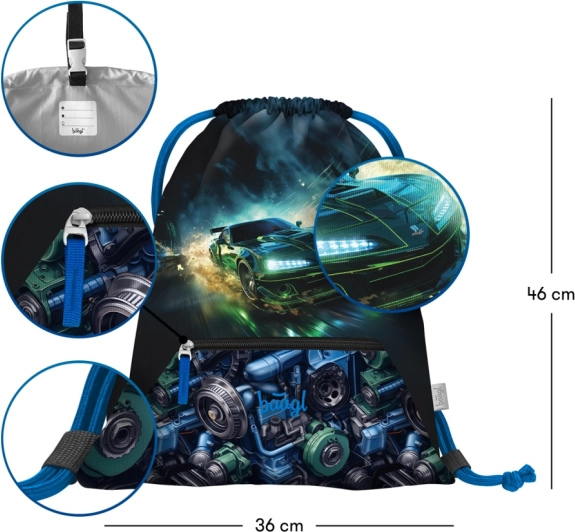 Stijlvolle zak voor schoenen en vrijetijdsactiviteiten met een raceauto-motief, biedt een duurzaam, afwasbaar materiaal, een praktisch vak met ritssluiting aan de onderzijde en stevige koorden voor comfortabel dragen op de rug. Dankzij de karabijnhaak maak je hem eenvoudig vast aan een schooltas of rugzak.