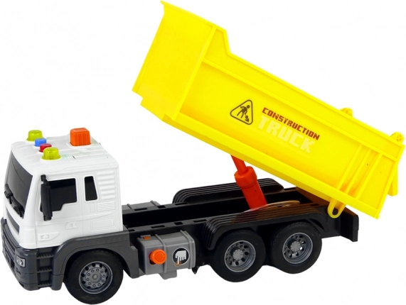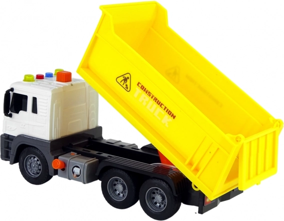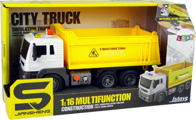 Deze gele bouwkiepwagen bootst een echte truck natuurgetrouw na, zodat kinderen in de rol van machinist op de bouwplaats kunnen stappen. Met de kantelbare laadbak verplaatsen ze moeiteloos “materiaal” en met de lichten en geluiden wordt het spel nog realistischer. De traagheidaandrijving heeft slechts een duwtje nodig en de truck rijdt vanzelf.