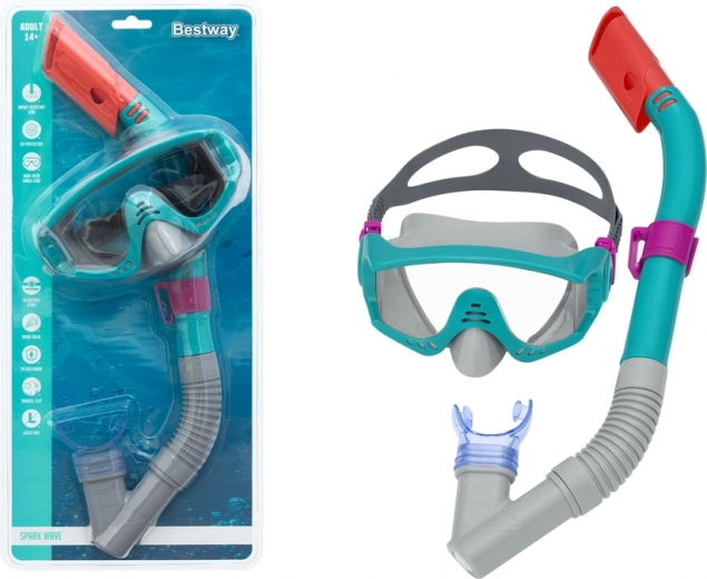 De BESTWAY snorkelset voor jeugd en volwassenen vanaf 14 jaar combineert een comfortabel masker en snorkel voor veilig verkennen onder het wateroppervlak. Zachte siliconenafdichting en een verstelbare band zorgen voor perfecte pasvorm zonder lekken, de duurzame lens met UV-filter beschermt de ogen en de snorkel met zacht mondstuk en bescherming tegen binnendringend water maakt ademen gemakkelijk. De lichte, kleurrijk aantrekkelijke set is ideaal voor op vakantie en in het zwembad.