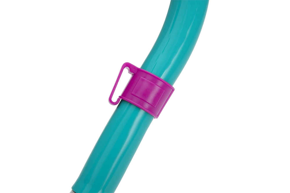 De snorkel is uitgerust met een zacht siliconen mondstuk voor comfortabel ademen en een bovenzijde met bescherming tegen binnendringend water. De praktische clip voor bevestiging aan het masker houdt alles op zijn plek, zodat bewegen in het water zo natuurlijk mogelijk blijft.
