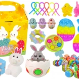 2× pop it (konijn en ei), antistress-donut, 2× pop it-armband, pop it-konijn, knijpbaar konijntje, joystick met draaielementen, vouwkubus (fidget), 4× rubberen rek-sliert, pop it-lolly, 4× konijnenfiguurtje, noten- sleutelhanger, 2× figuur (konijn en kuiken), 16× paasei