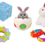 Pop it-donut, armbanden, konijn en ei, knijpfiguurtjes en een fidgetkubus – perfect voor zintuiglijk spel en stressverlichting.