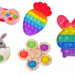 Deze kleurrijke paascollectie Fidget Toys Pop It valt op met motieven van konijntjes, wortels en paaseieren. Kinderen kunnen de speeltjes knijpen, pop-it belletjes indrukken, draaien en uitrekken, wat de concentratie bevordert en helpt af te leiden van spanning. Perfect voor thuis, onderweg of als kleine beloning in het mandje.