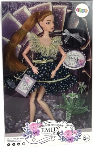 Ontdek de wereld van mode met pop EMILY – de ideale keuze voor creatief spel, modeshows thuis en alledaagse verhaaltjes. De pop draagt een prachtige donkerblauwe jurk met witte bloemetjes en bijpassende zwarte pumps met hak. Het lange haar nodigt uit tot kammen en het maken van kapsels, terwijl de beweegbare ledematen natuurlijke poses mogelijk maken alsof ze op een echte catwalk staat.