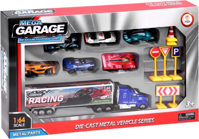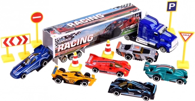 6 sportauto's, 1 vrachtwagen met trailer, verkeersborden