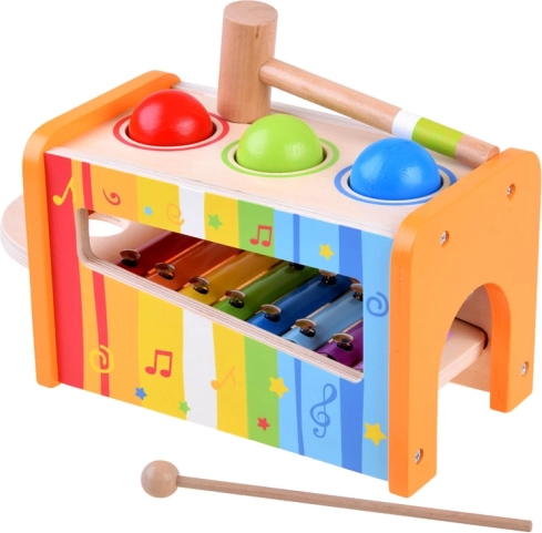 De houten xylofoon en het hamertje ondersteunen niet alleen muzikale, maar ook motorische vaardigheden van kinderen.