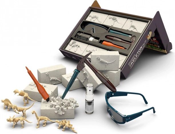 De set is ideaal als creatief en educatief cadeau voor nieuwsgierige kinderen. De werkwijze is eenvoudig: bevochtigen, voorzichtig met beitel en hamertje blootleggen, stof wegvegen met de kwast en tot slot het skelet monteren. Het resultaat is een kleine thuiskollectie van zes dinosaurusmodellen.
