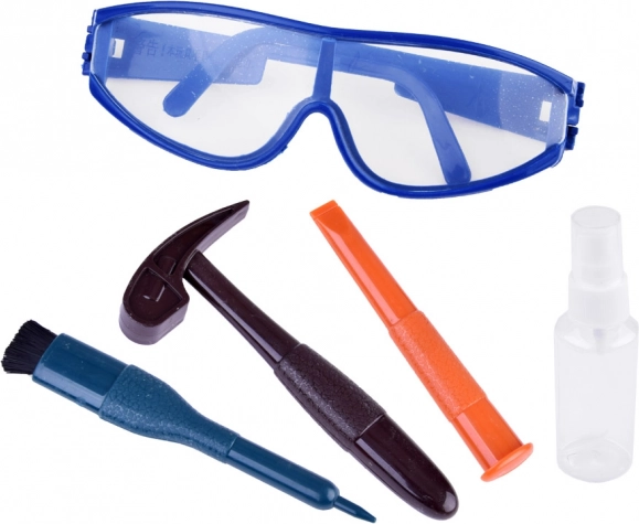 Beitel, hamertje, kwast, plantenspuit en beschermbril – complete uitrusting voor kleine onderzoekers die fijne motoriek en coördinatie stimuleert.