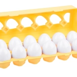 De gele drager biedt plaats aan alle 12 eitjes, houdt alles netjes bij elkaar en maakt dragen en opruimen na het spelen eenvoudig.